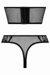 Ensemble de lingerie torride comprenant un bustier seins nus et son string ouvert en similicuir, dentelle et fine maille.