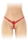 String rouge minimaliste et hyper coquin, ouvert à l'entre-jambes, avec motif en dentelle et des ornements, par la marque de lingerie libertine Fashion Secret.